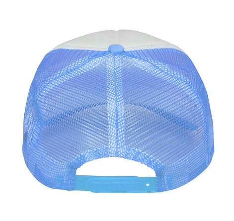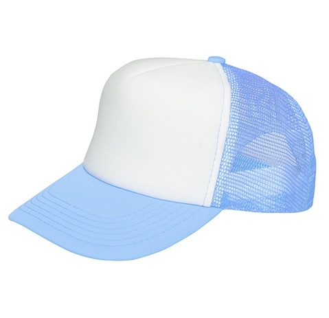 Czapka wykonana z pięciu paneli - panel przedni z białego poliestru do nadruku, pozostałe z siateczki.